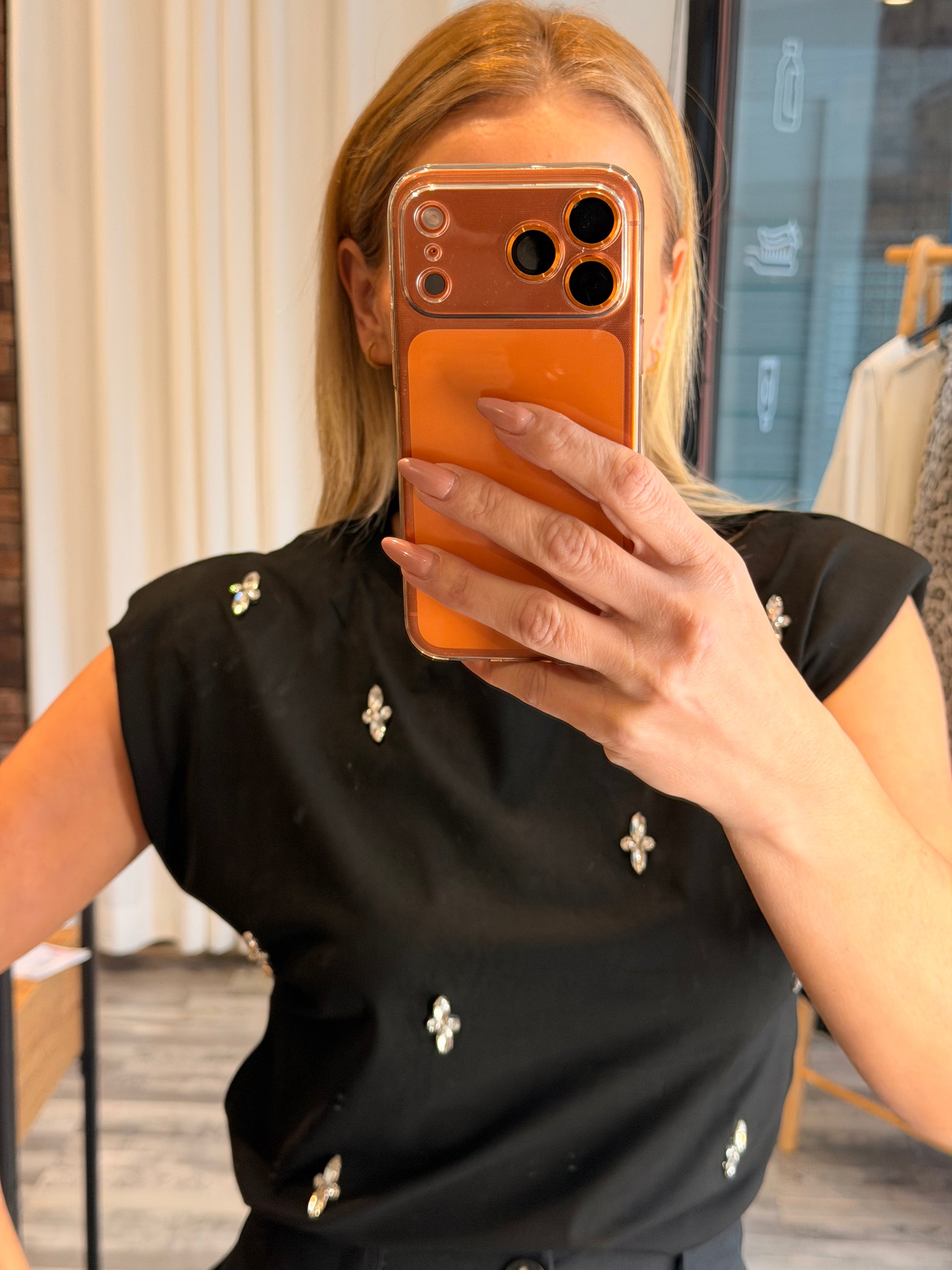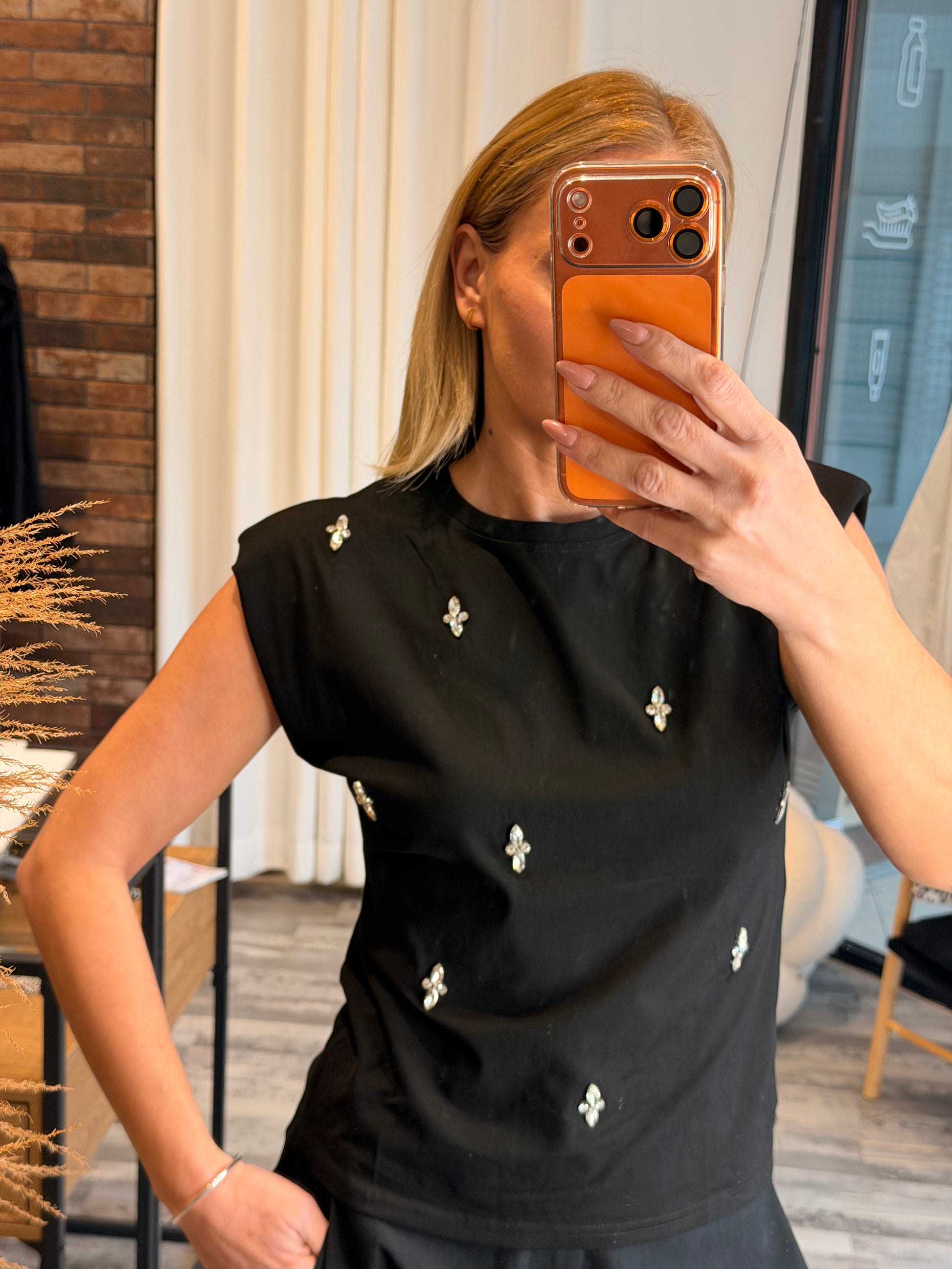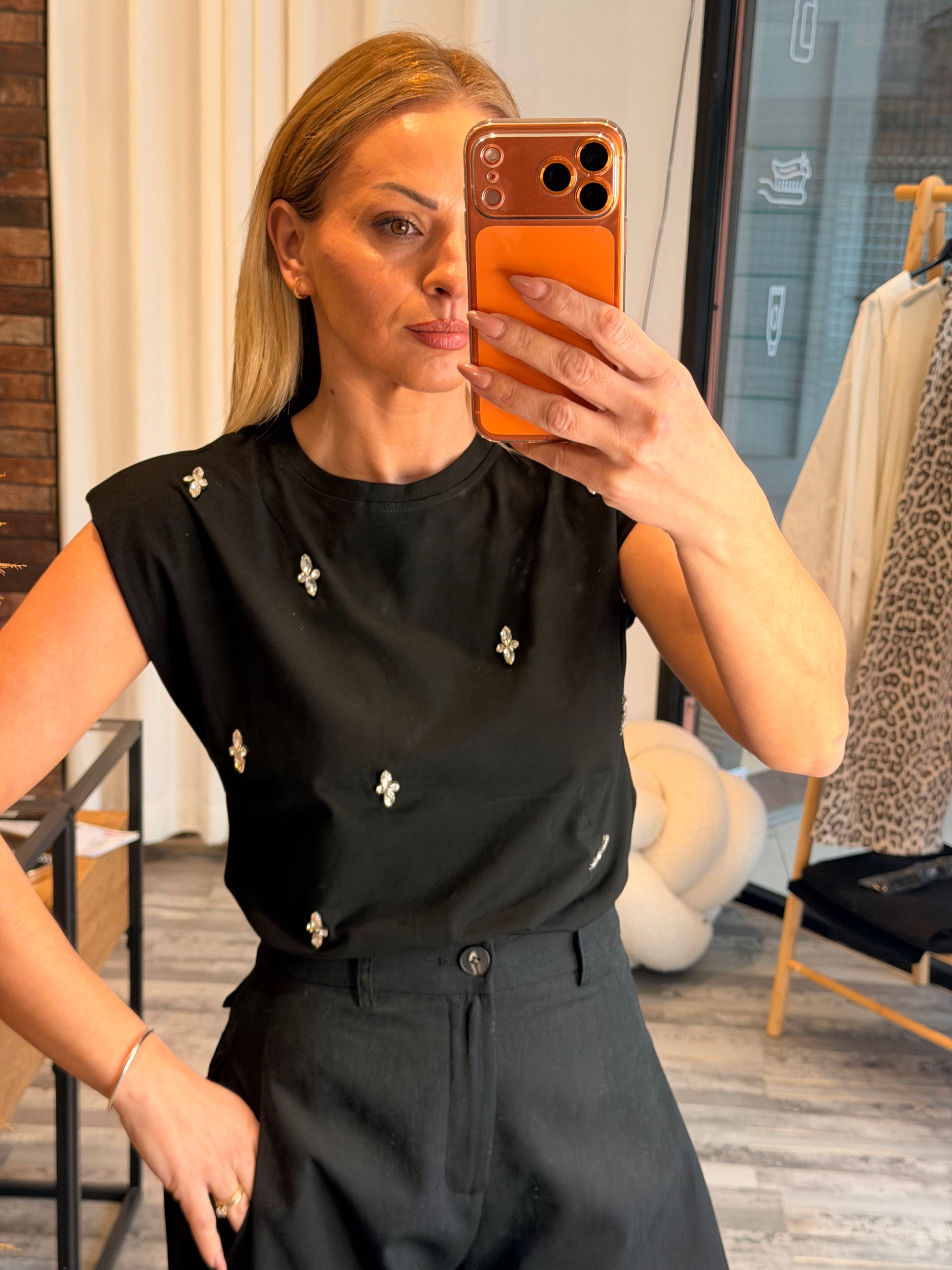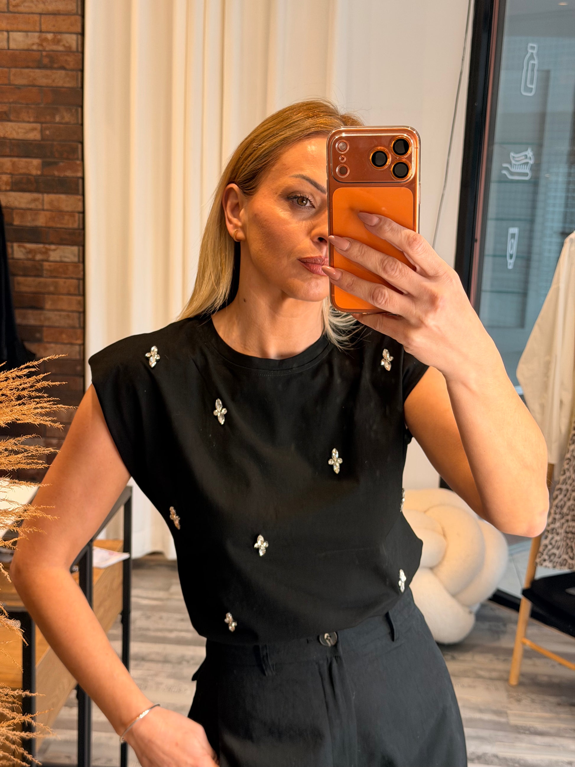 Βαμβακερή μπλούζα με βάτες και πέτρες μαύρη