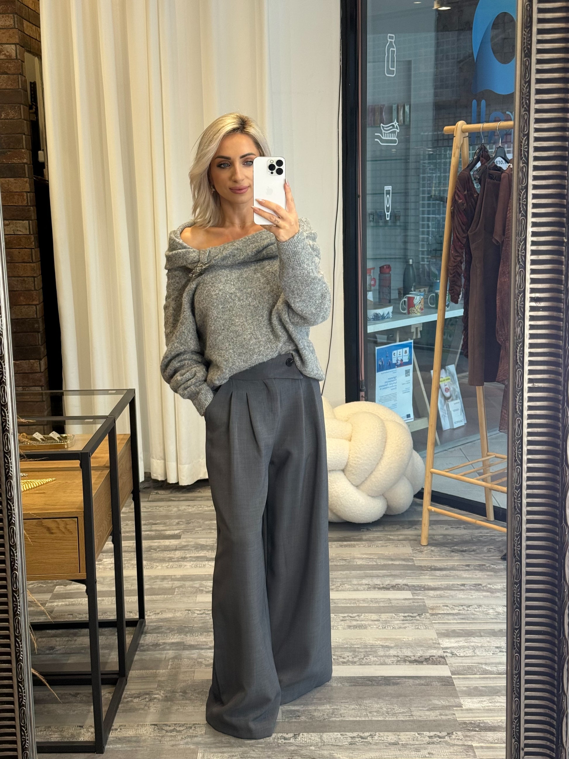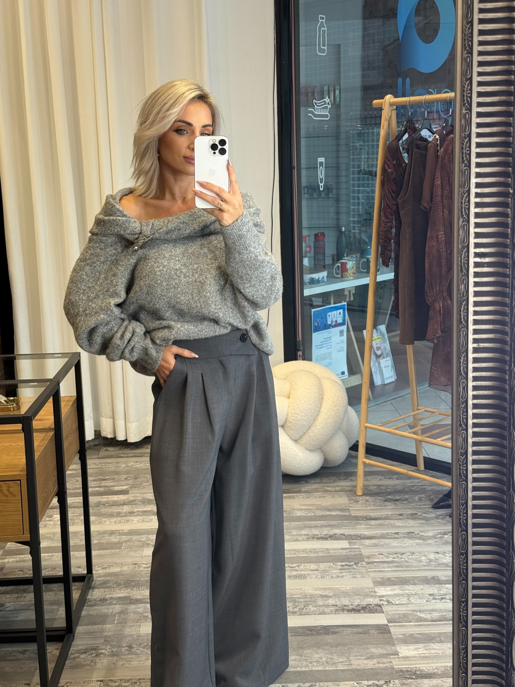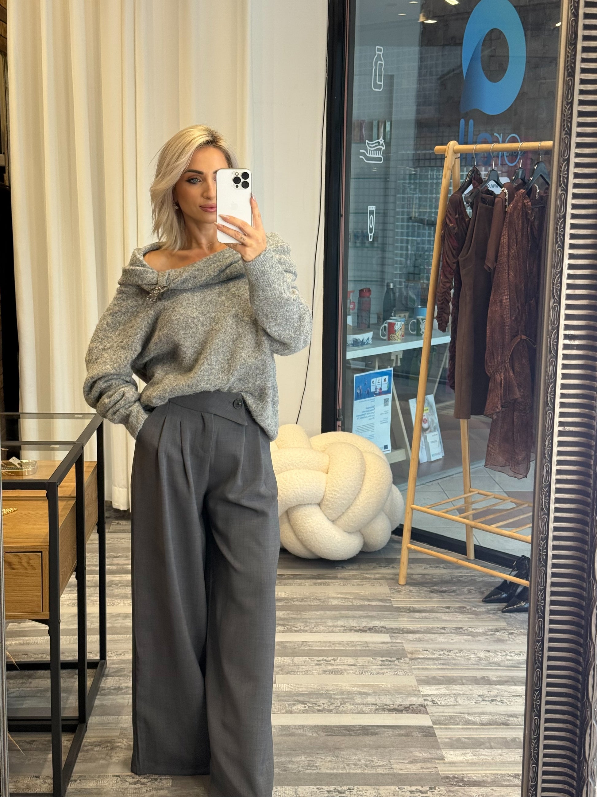Κομψό γκρι παντελόνι με πιέτες που χαρίζουν άνεση και μια κλασική γραμμή. Το ιδιαίτερο, ασύμμετρο κούμπωμα στη μέση προσθέτει μια διακριτική αλλά μοντέρνα πινελιά, κάνοντάς το να ξεχωρίζει από τα συνηθισμένα.