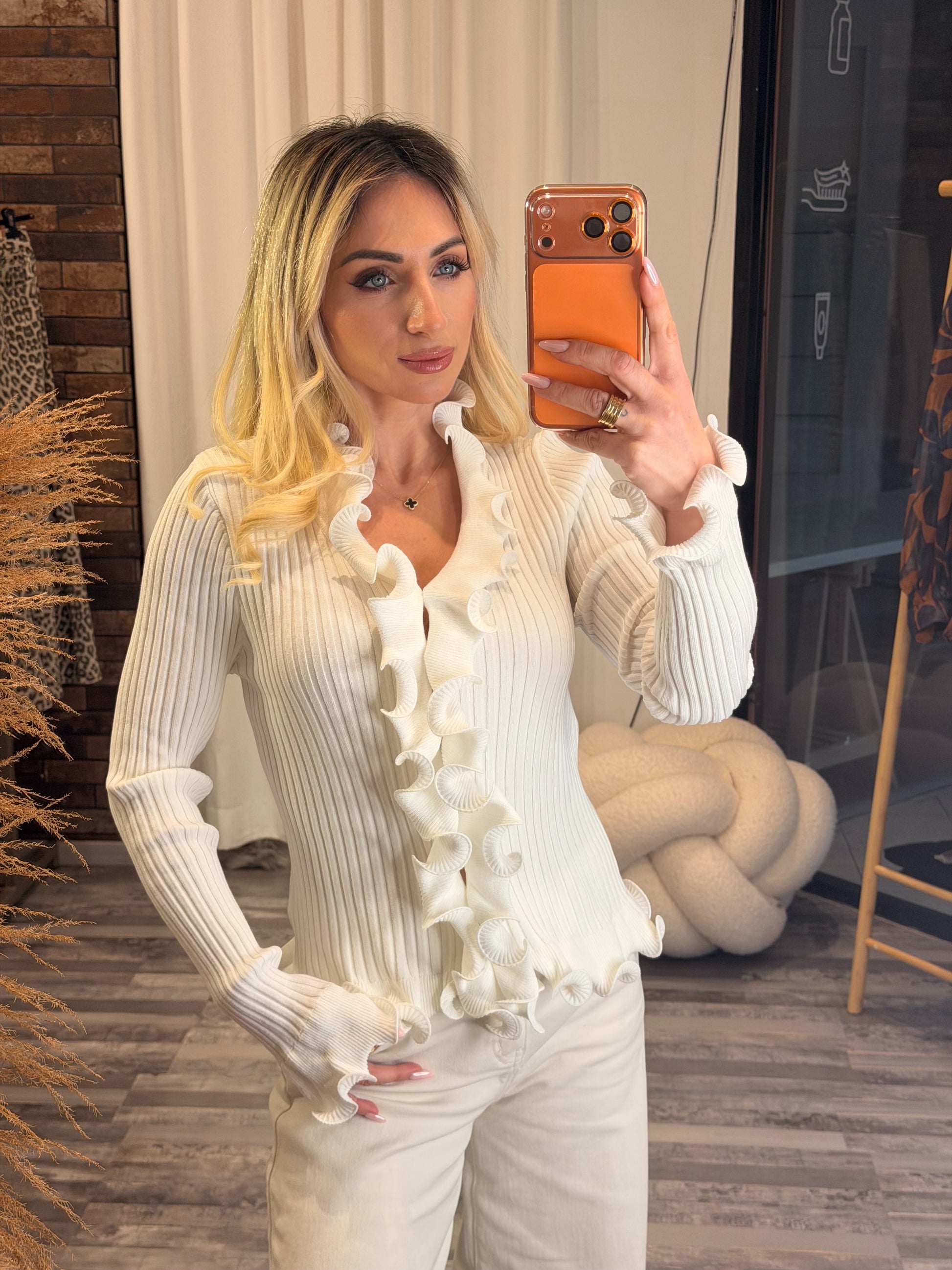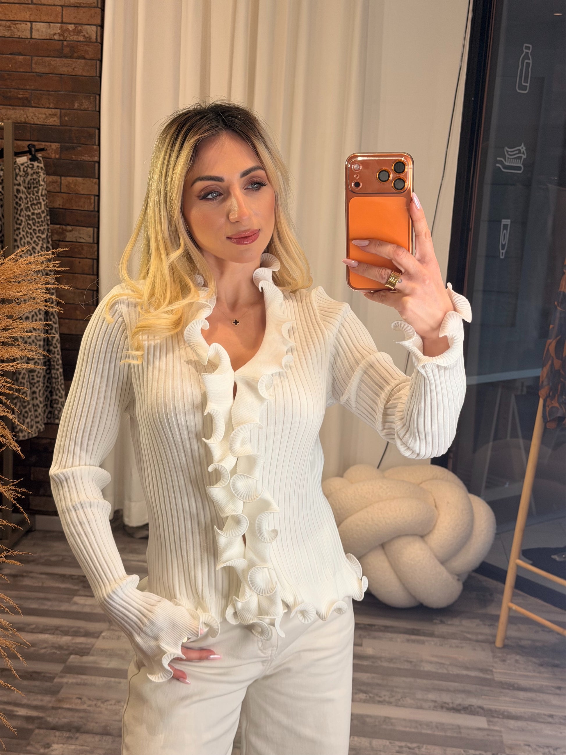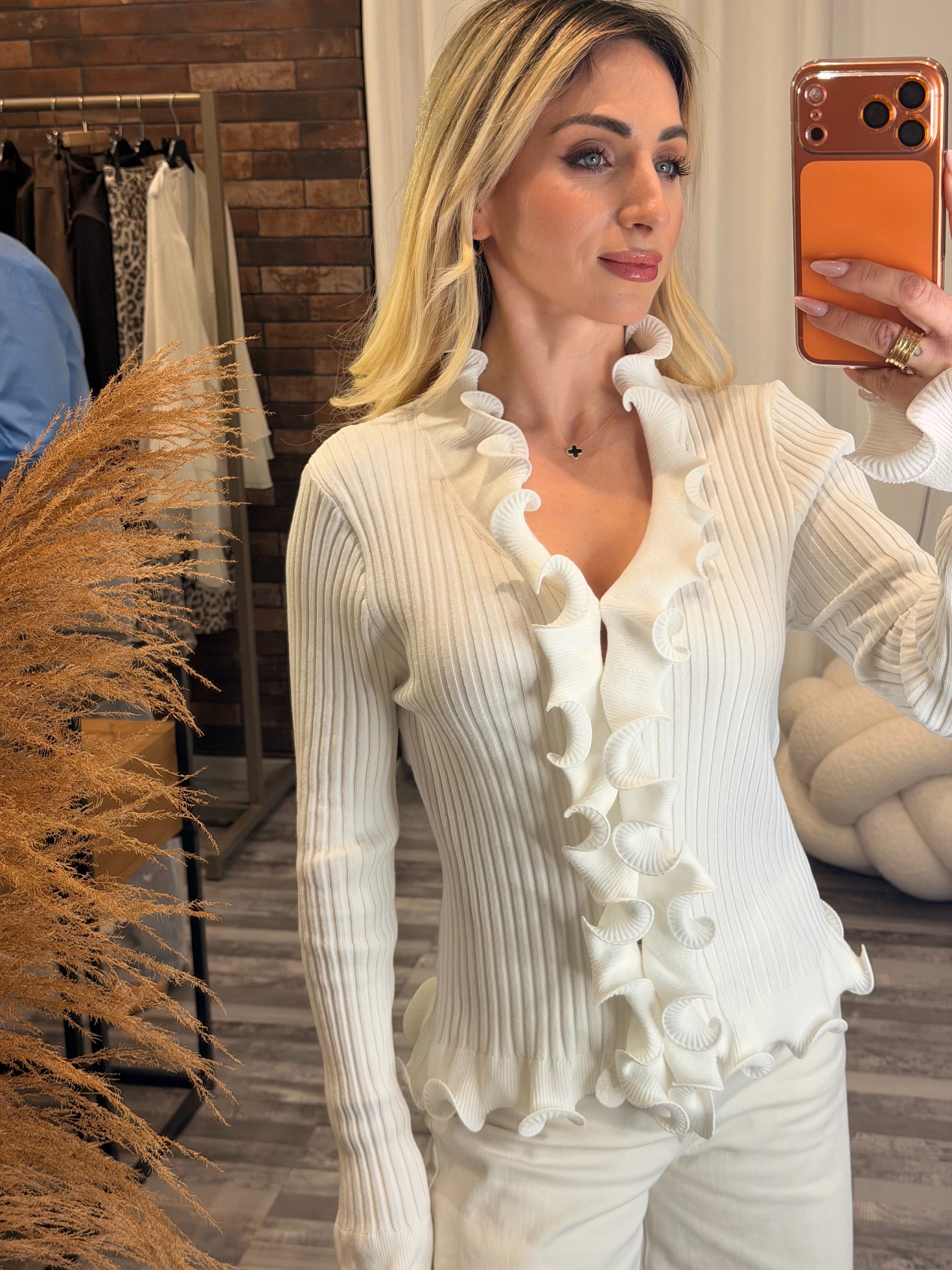 Ριπ πλεκτή μπλούζα με βολάν στα μανίκια και στο μπροστινό μέρος, που προσθέτουν θηλυκή και κομψή πινελιά. Άνετη εφαρμογή και διαχρονικό στυλ για καθημερινές και πιο ιδιαίτερες εμφανίσεις