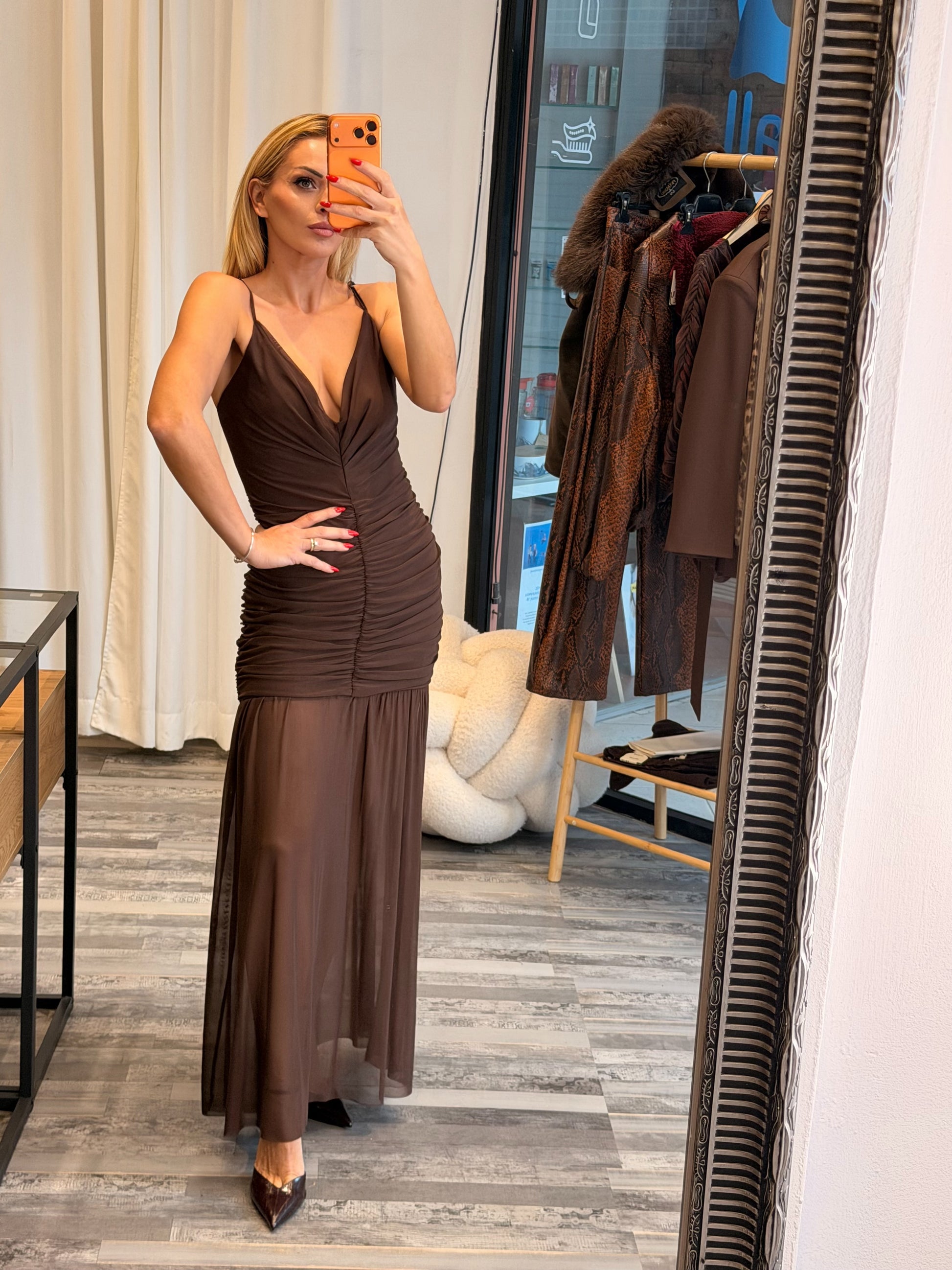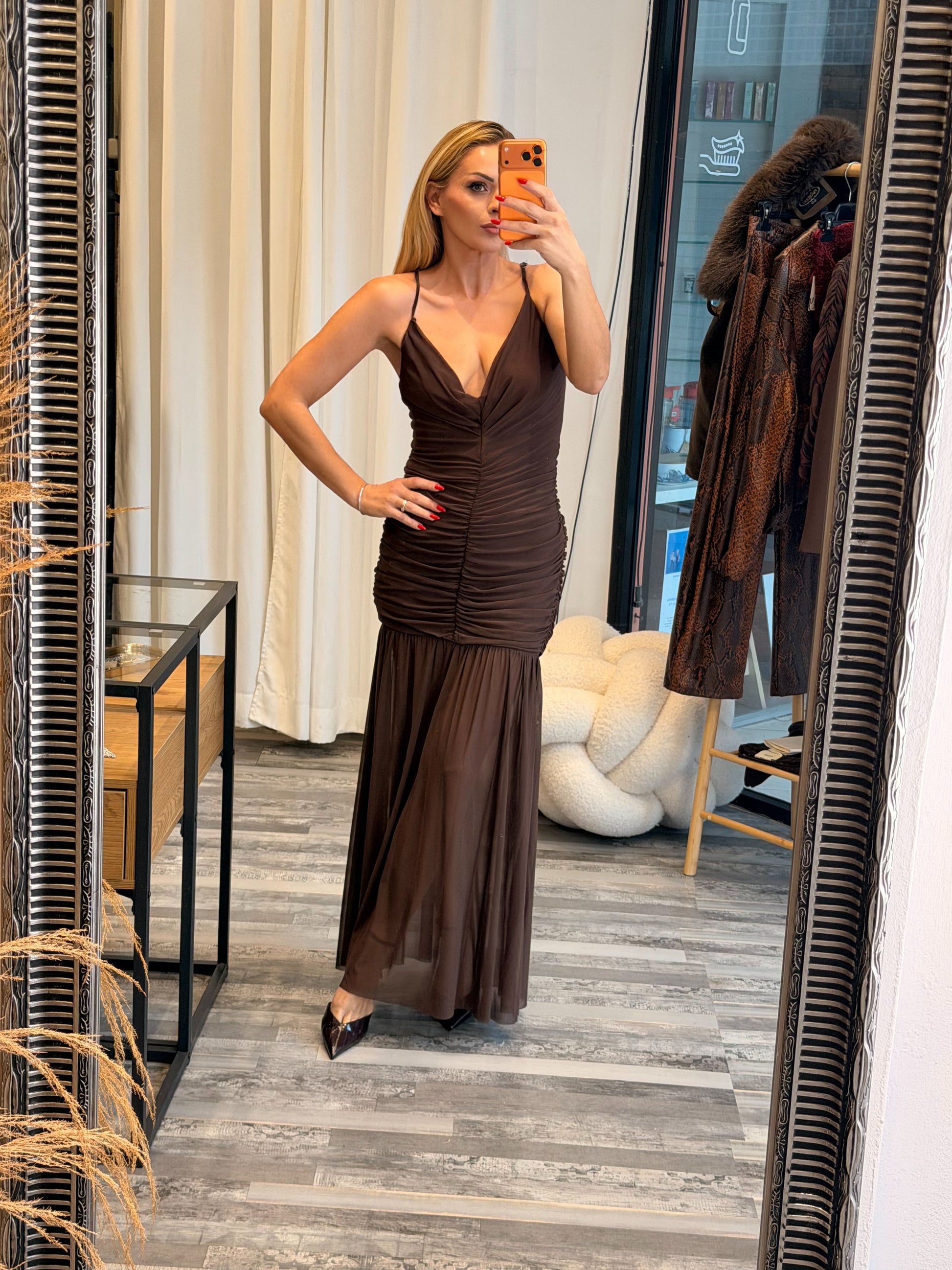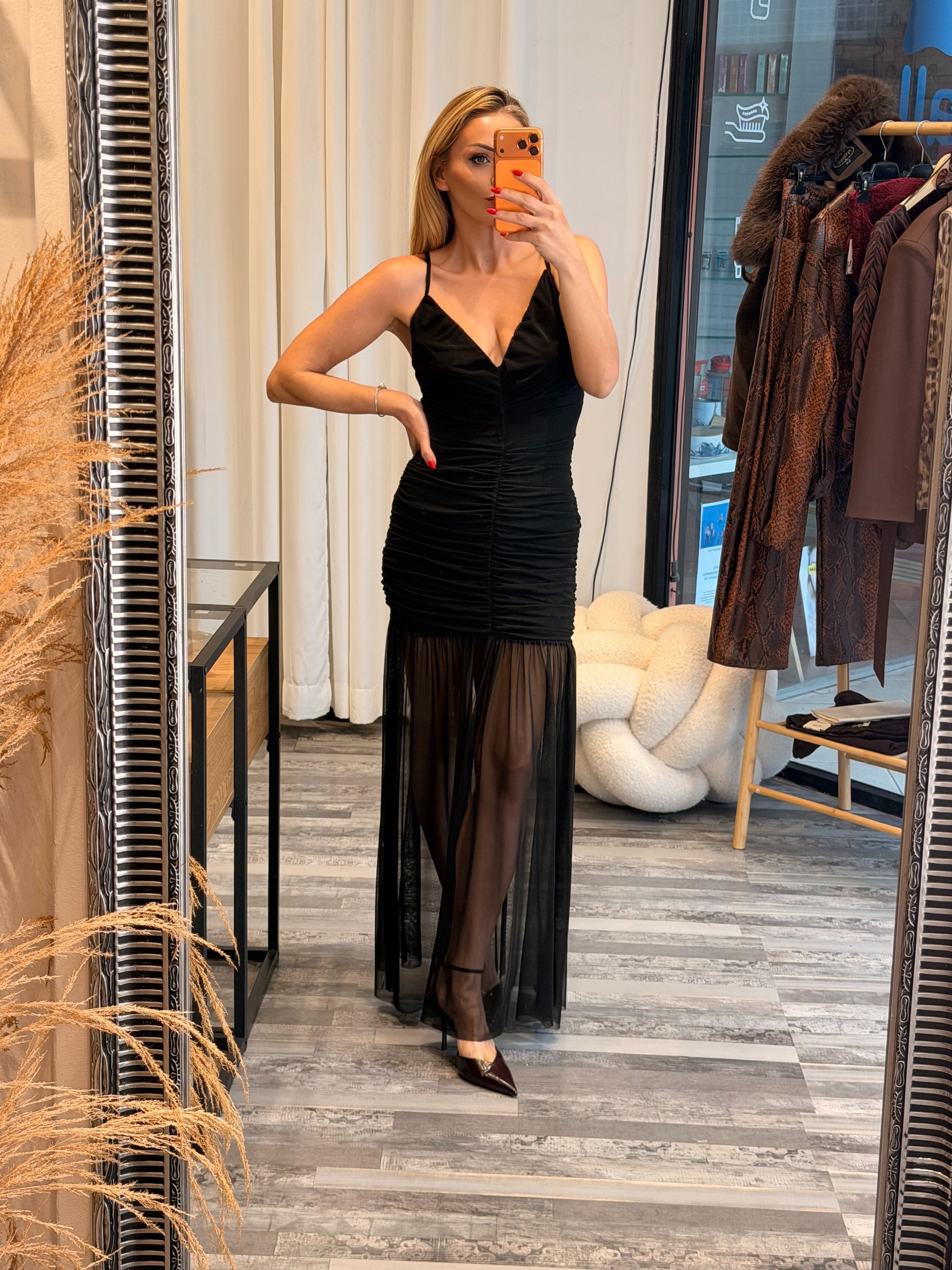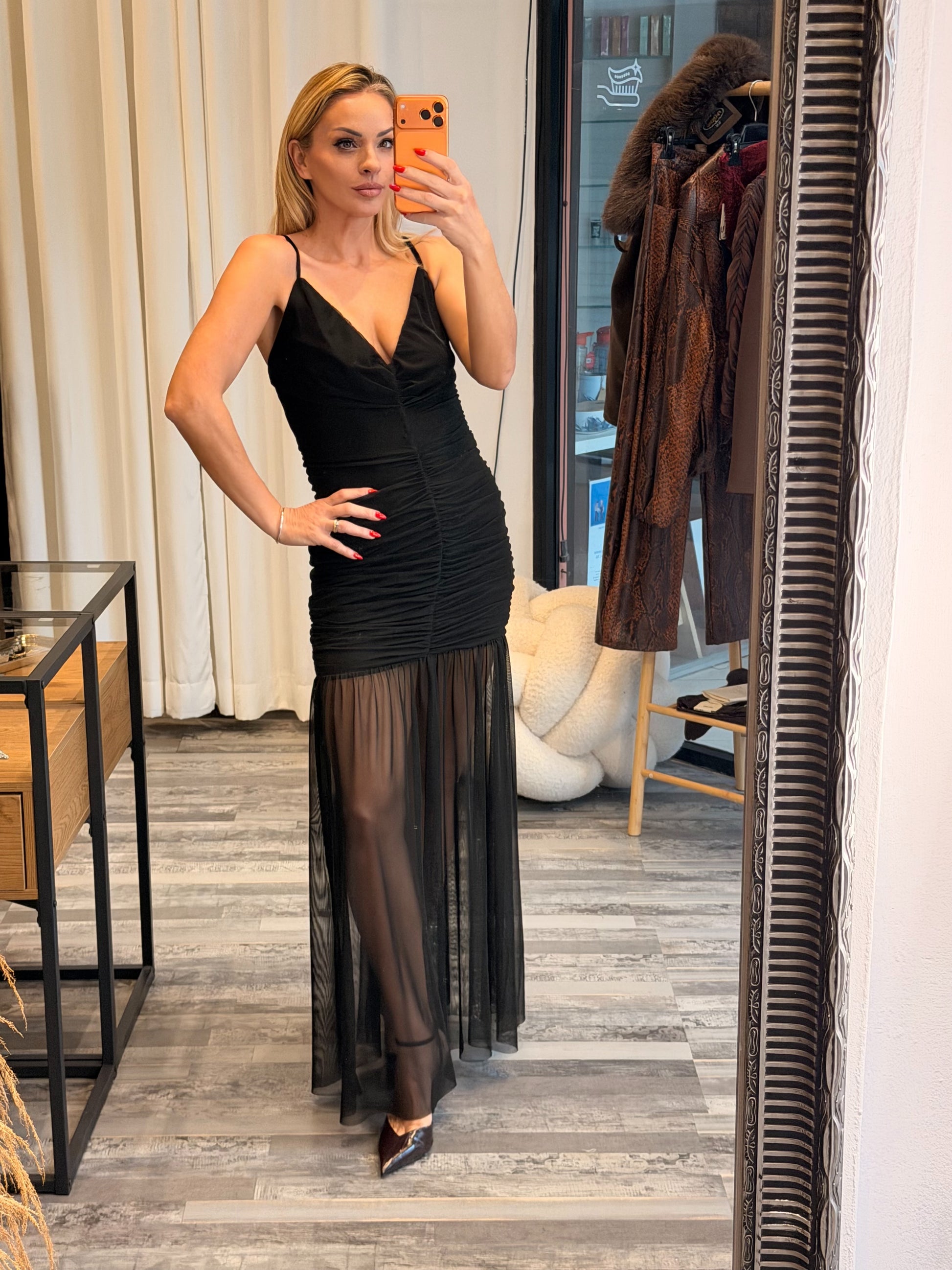 Maxi Φόρεμα με Σούρες και Διαφάνεια